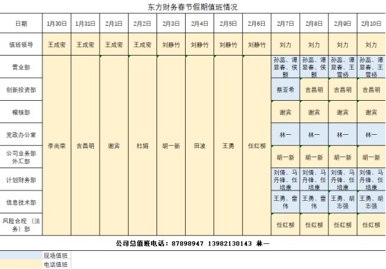 根据集团公司及集团内主要成员企业春节放假时间安排,经研究,财务公司1月30日-2月10日放假,放假期间为保证业务开展,各相关业务部门人员值班,具体安排如下: